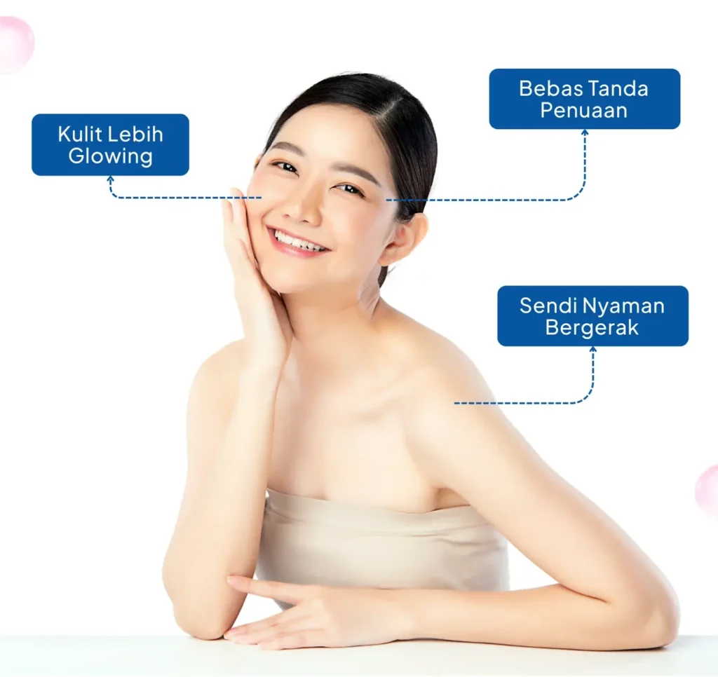 “Meskipun tubuh memproduksi kolagen secara alami, produksi kolagen cenderung menurun seiring bertambahnya usia, ditambah adanya kolagenase (perusakan kolagen) di dalam tubuh. Sehingga mempercepat datangnya tanda-tanda penuaan seperti Kerutan, Kulit Kendur, dan Keluhan Nyeri Sendi.”